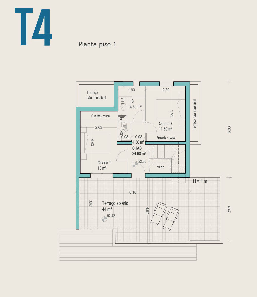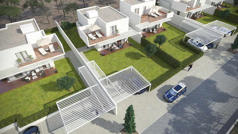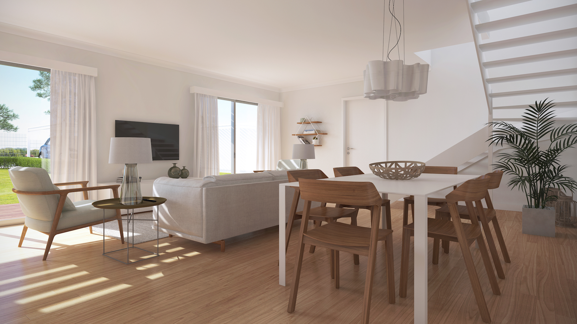 As moradias V3 (3 quartos + sala) e V4 (4 quartos + sala), são construídas com elevados padrões de qualidade e sofisticação técnica, incorporando estores elétricos e a mais moderna tecnologia desde a fibra óptica às tomadas multimédia.